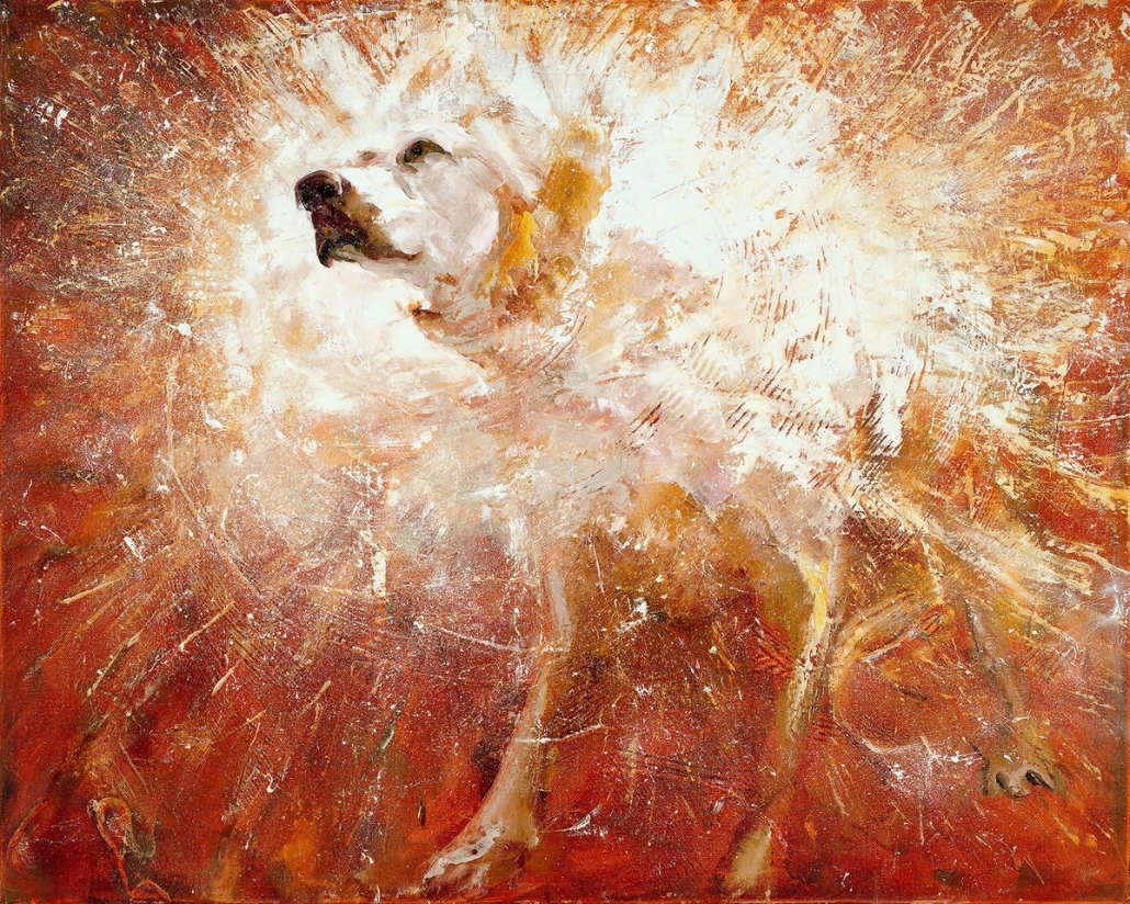 I was born in Palo Alto, CA and now a long time resident of Maine, I paint with oils on canvas or linen. Coming from an artistic family background and exceptional high school art program there was no lack of encouragement to create. I studied sculpture and design at Moore College of Art in Philadelphia and have continued my education through classes and painting groups, and occasionally teaching students individually. Returning to painting after many years of developing an interior and landscape design business, I focus my work on capturing the likeness and emotions of animals, especially the relationship between man and his canine best friend. I paint other animals as well, inspired by my deep feelings for the Maine countryside, the horses on our farm and my 7 devoted Labrador Retrievers. I convey the motion, shape and love for the animal with loosely applied sweeping brushstrokes or pallet knife. Using glazing mediums, wax, chalk dust and thick over painting to sculpt subjects on the canvas, I bring them to life in an unconventional form.